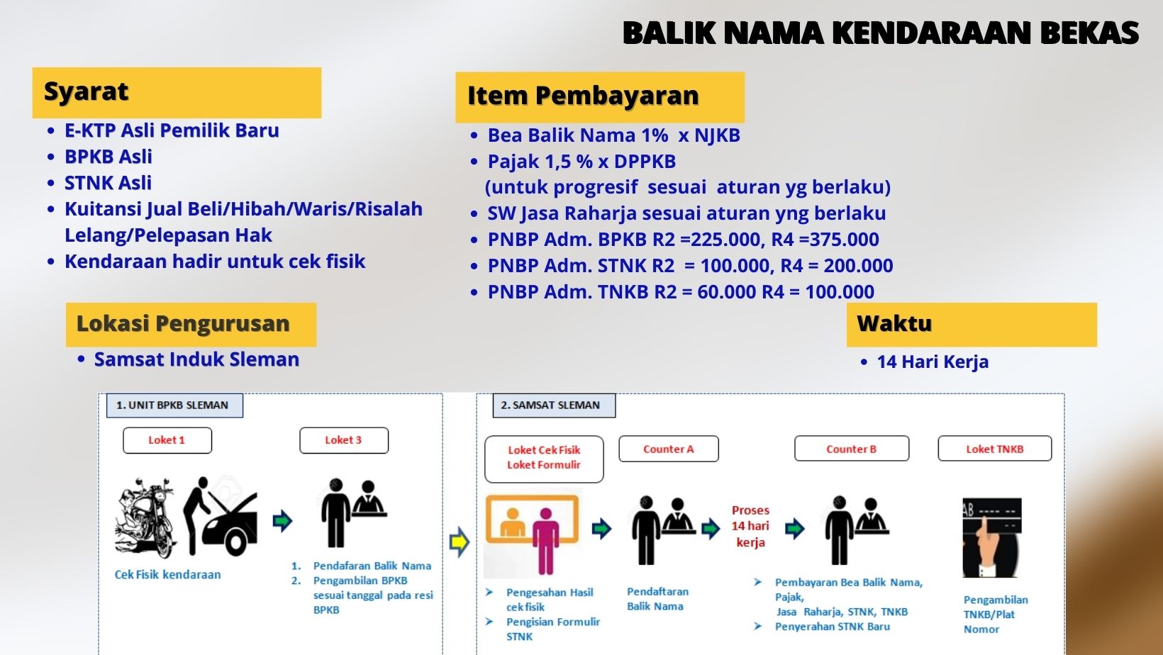 - Wajib pajak datang ke layanan BPKB Samsat Sleman menuju Loket 1 untuk cek fisik kendaraan.