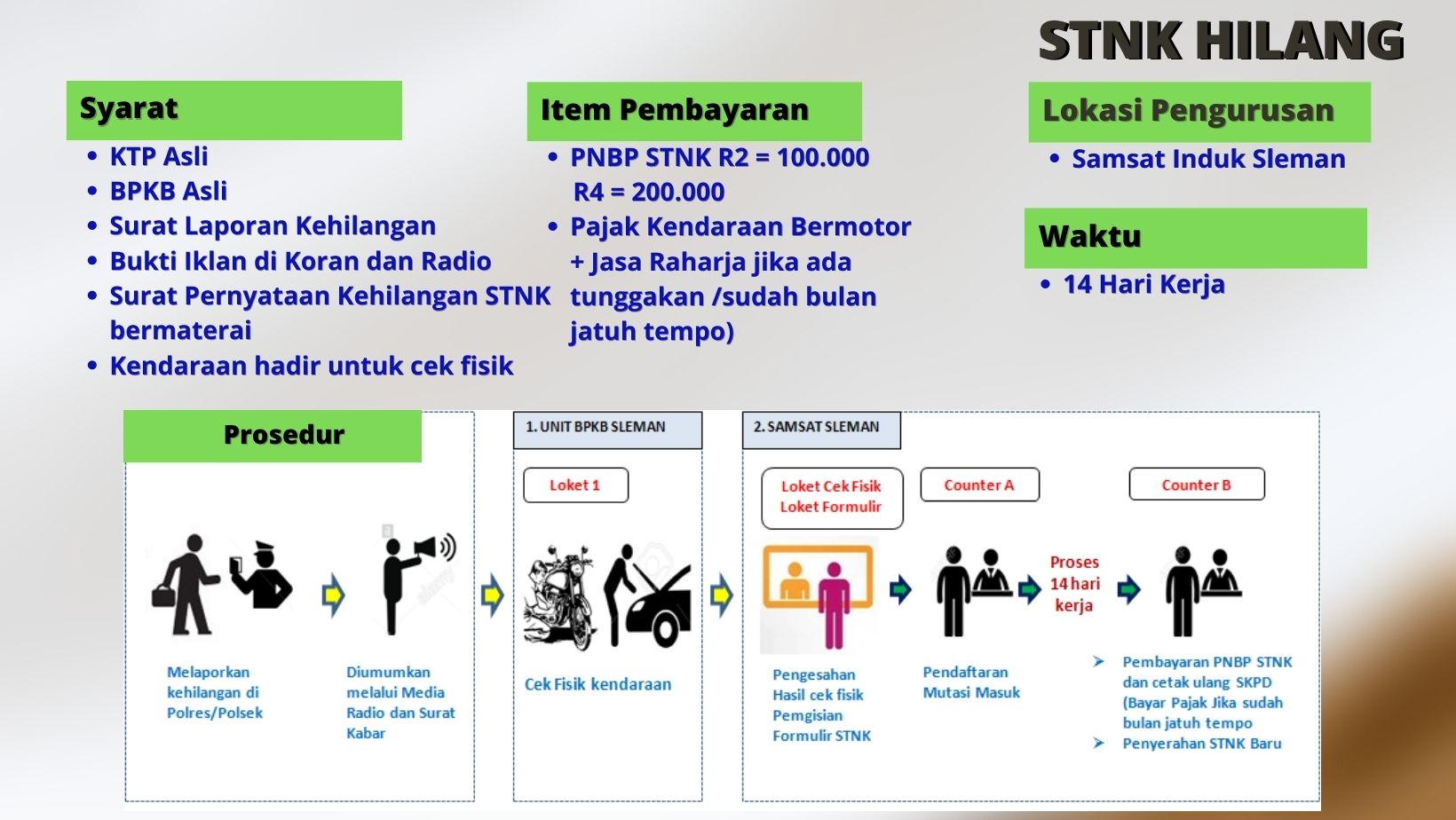 Setelah persyaratan terpenuhi silakan mengajukan permohonan duplikat STNK ke Samsat. Proses permohanan duplikat STNK dimulai dari cek fisik di layanan cek fisik BPKB Sleman yang berada di halaman depan Samsat Sleman. Setelah cek fisik silakan menuju ke loket cek fisik di Basement Samsat untuk pengesahan dan mengambil formulir permohonan STNK di Loket Formulir.