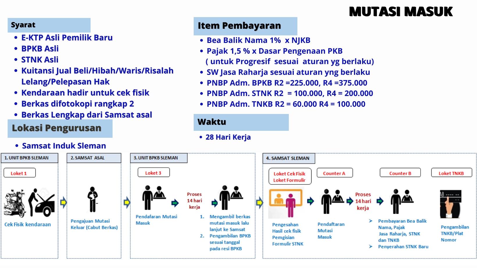 - Setelah berkas berhasil dicabut dari samsat asal , selanjutnya menuju Samsat Sleman ke loket 1 Untuk untuk pengesahan hasil cek fisik dan dilanjutkan ke loket 3 di Gedung Layanan BPKB. dari loket 3 akan mendapatkan tanda terima pendaftaran mutasi masuk dan akan diminta datang lagi kurang lebih 14 hari kerja berikutnya.